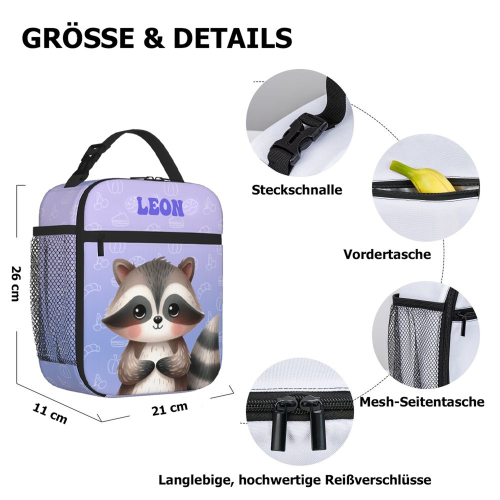 Auf dieser Brotzeittasche sind niedliche Cartoon-Tiere wie Waschbären, Igel, Koalas und Hirsche abgebildet, die eine charmante und verspielte Szene schaffen. Sie können Ihr Lieblingstiermuster auswählen und es mit dem Namen Ihres Kindes versehen, um die Brotzeittasche einzigartig zu machen und sicherzustellen, dass sie in Schulen oder Kindertagesstätten nicht verwechselt wird.