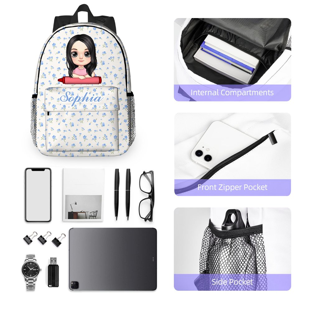 Dieser Rucksack zeigt Buntstift-Cartoonfiguren als Hauptdekorationselement und verleiht ihm einen verspielten Touch. Wir bieten zwei verschiedene Hintergrundoptionen an: einfarbig für einen einfachen und stilvollen Look und ein Blumenmuster für einen frischen und niedlichen Stil. Außerdem kann der Rucksack mit dem Namen des Kindes personalisiert werden, was jeden Rucksack zu einem Unikat macht und den Wunsch nach individuellen Artikeln erfüllt.