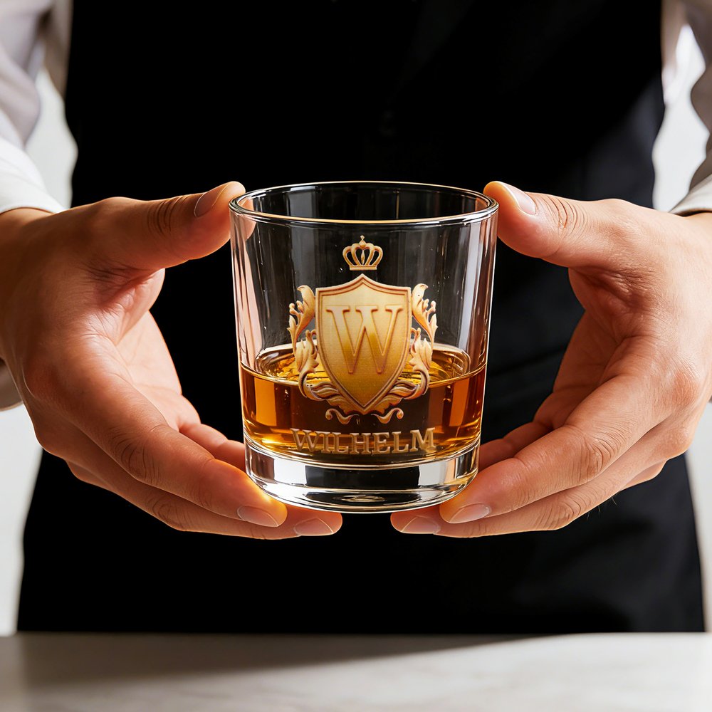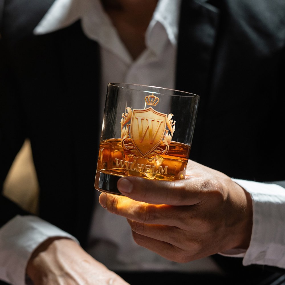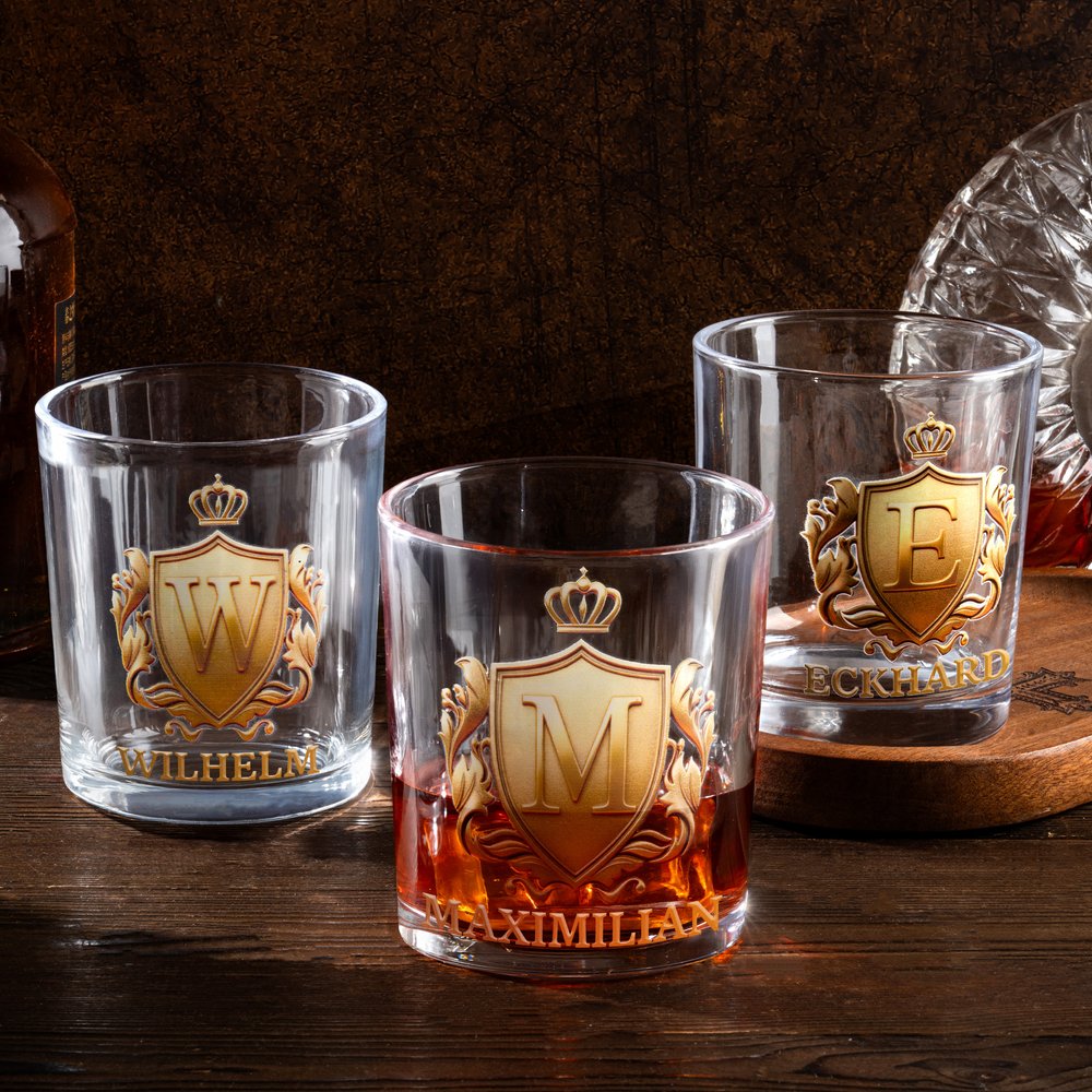 Das Glas überzeugt durch ein auffälliges goldenes Wappen, das individuell mit Initialen und Namen personalisiert werden kann. Es ist klar und robust gefertigt und verbindet auf ideale Weise Vintage-Eleganz mit einer persönlichen Note. So wird es zu einem besonderen Begleiter für Ihr Whisky-Verkostungserlebnis und zu einem geschätzten Sammlerstück für Whisky-Enthusiasten. Dieses Glas ist mehr als nur ein Trinkgefäß – es repräsentiert Ihre Persönlichkeit und Ihre Wertschätzung für hochwertige Spirituosen.